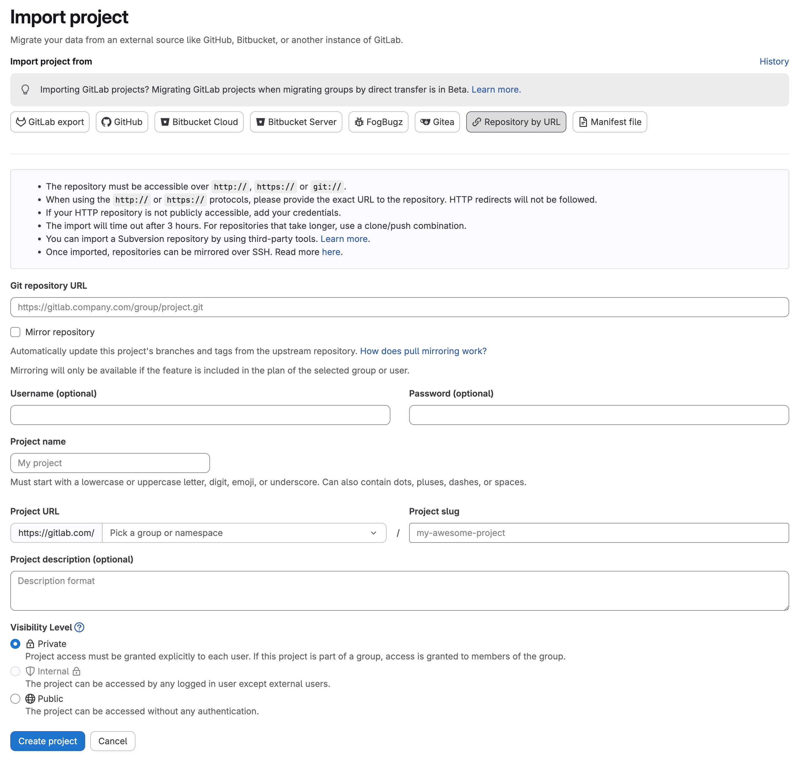 - In GitLab, click the plus icon in the top menu and go to New project/repository > Import project > Repository by URL.