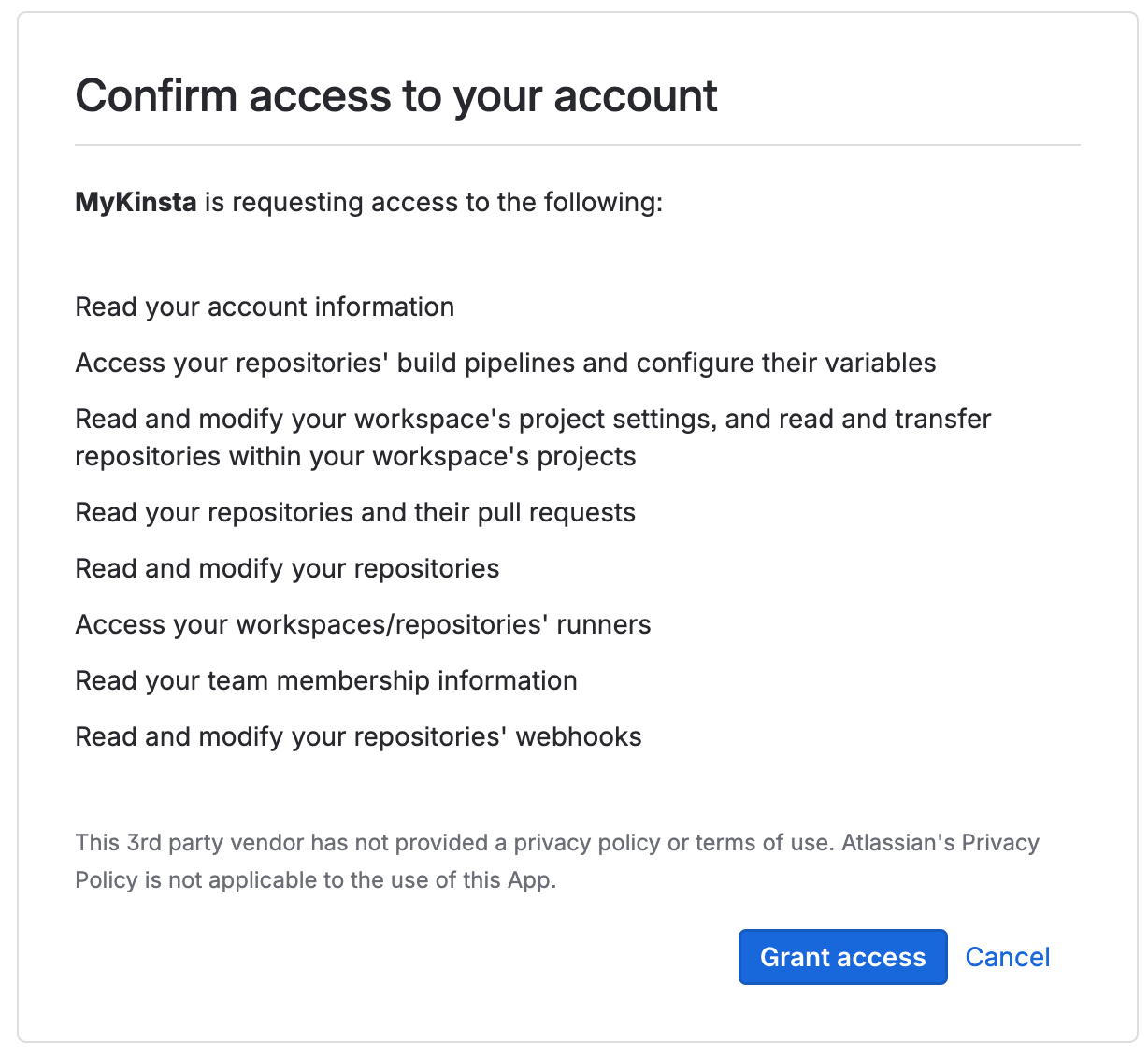 Confirm Kinsta's access to connect to your Bitbucket account.